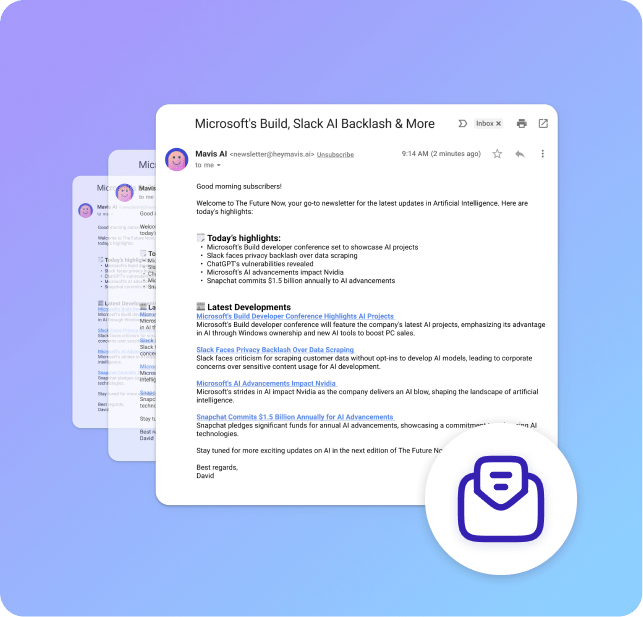 Pick any topic and Mavis AI will create news articles covering the latest stories, as well as summarize those news stories in a roundup email for you, every day.